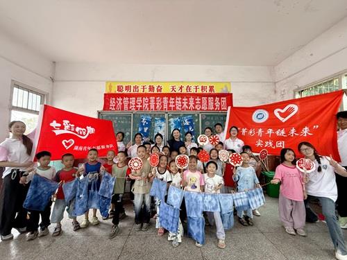 “菁彩青年链未来”实践团以“文化”为桥,点亮留守儿童童心。志愿者带领孩子体验剪纸艺术,生肖、节日图案在指尖绽放;将安全教育融入刻纸教学,“二十四节气”作品见证非遗魅力;扎染环节中,孩子们亲手完成扎结、浸染,独一无二的方巾承载着文化自信,志愿者更以温情陪伴搭建心灵桥梁,回应孩子“明天还来吗”的热切期盼。