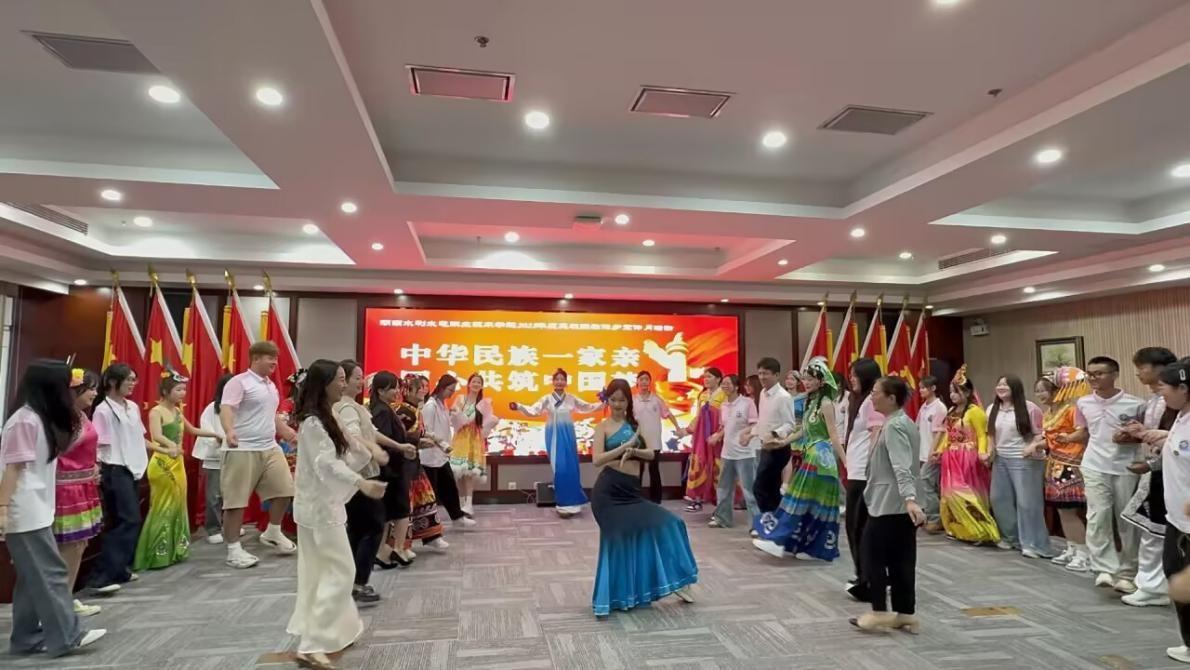 活动尾声,学院文娱部献歌舞《五十六个民族五十六朵花》,欢快旋律与优美舞姿尽显各民族风采。民族新生与老师上台,众人牵手互动,将现场气氛推向高潮。最后,全体师生手持亲手制作的中国结合影,定格下这一满含民族情谊的温馨时刻。
