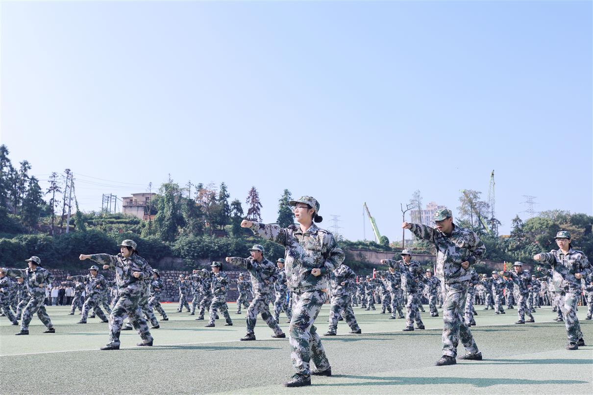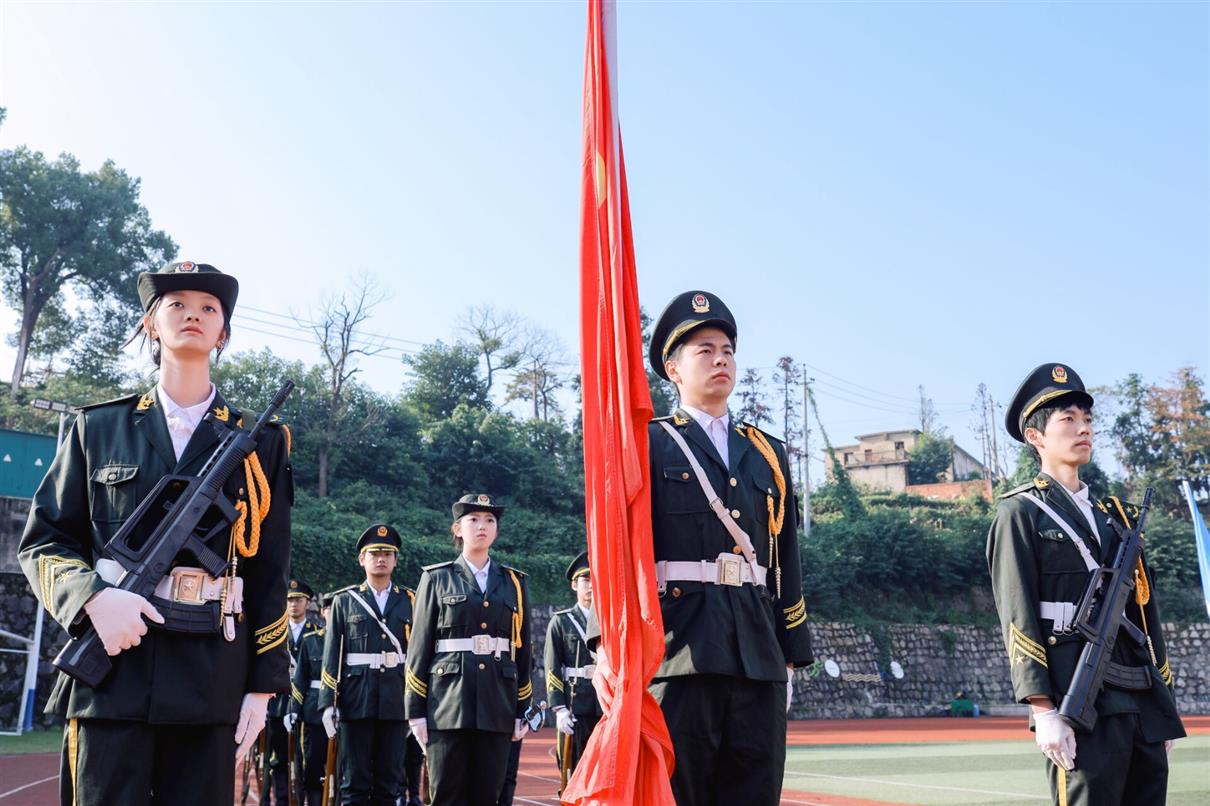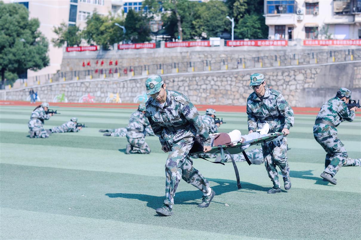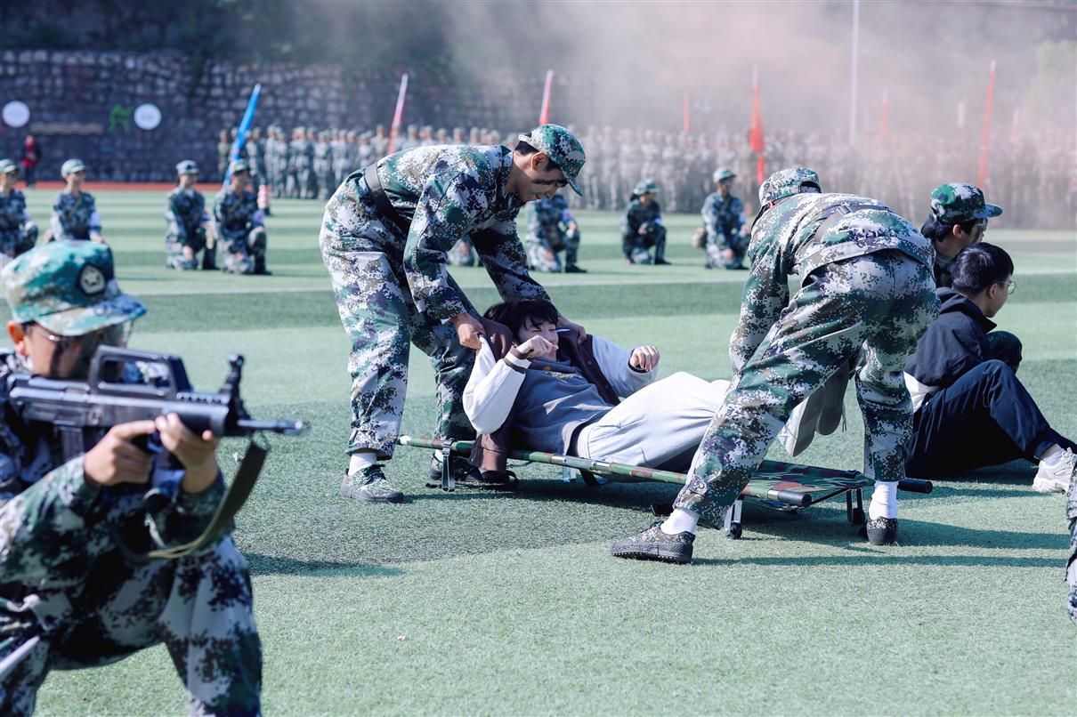 上午9时,大会在庄严的国歌声中正式开幕,全体师生肃立行礼,注视着五星红旗冉冉升起。随后的军训成果汇报环节亮点纷呈、气势如虹。2025级新生以挺拔的军姿、铿锵的步伐、嘹亮的口号,依次进行了分列式、队列表演、擒敌拳、战场救护、持枪战术等科目展示。他们动作刚健、斗志昂扬,如江河奔涌,展现出新时代青年淬火成钢的昂扬风貌,赢得了现场持续而热烈的掌声。