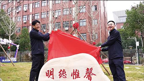座谈会后,全体人员移步沁雅园举行纪念树捐赠仪式。校友们共同为母校捐赠了九株银杏树和纪念石碑。党委书记常世名与副校长蒋买勇共同为“明德惟馨”的石碑揭彩。