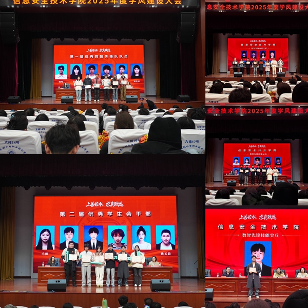 为持续强化学风建设,营造积极向上的育人氛围,信息安全技术学院于1月14日晚在礼堂召开2025年度学风建设大会。学院主要负责人、全体教师、辅导员及学生代表齐聚一堂,共同回顾过去一年的学风建设成果,展望未来发展蓝图。